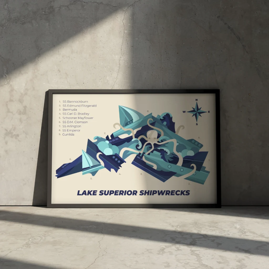 I am currently a Junior studying Graphic Design at Northern Michigan University. I believe that whether the goal is to express a specific emotive quality, to communicate important information, or to influence an audience, storytelling is key. With an app prototyped to support a user through a conference, an e-commerce website that catalogs and sells meaning, an illustrated map of Lake Superior shipwrecks, and a peanut butter snack pack, the story is revealed through tactics such as hierarchy and line-weight in order to create emphasis and guide the viewer. Along with shape, texture, and color, which work to create tone and character, these visual strategies come together to shape a narrative
